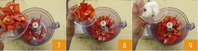 Transfira tudo para um liquidificador: melancia, tomate 7, pimentão 8 e a cebola 9.