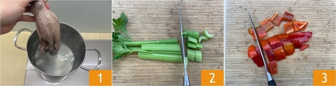 Comece cozinhando o polvo em uma panela com água fervente por 30 minutos ou até que fique macio ao tocá-lo com um garfo. Lave e corte o aipo 2 e os pimentões vermelhos 3 em pedaços.
