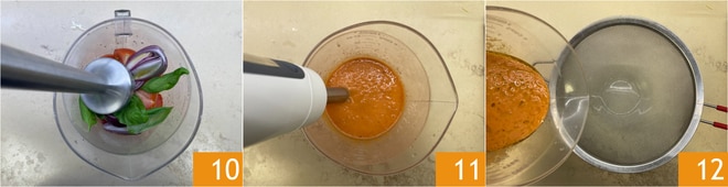 Bata bem com um mixer de imersão por alguns minutos 10. Quando a mistura estiver bem batida 11, passe-a por uma peneira 12.