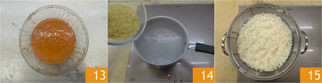 Reserve o gazpacho 13. Agora cozinhe o arroz em água fervente e salgada 14 pelo tempo indicado na embalagem, depois escorra 15.