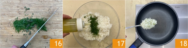 Pique o funcho e o tomilho 16 e adicione ao arroz, acrescente também azeite 17 e pimenta. Salteie em fogo alto por alguns minutos o arroz na frigideira 18.