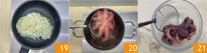 Reserve o arroz 19. O polvo neste ponto estará cozido 20, escorra-o 21.