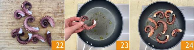 Corte os tentáculos 22. Em uma frigideira, aqueça um fio de azeite e coloque os tentáculos 23, dourando-os bem de ambos os lados 24.