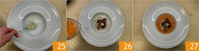 Emprate criando uma montanha central de arroz basmati 25, depois dois tentáculos no topo e no final despeje o gazpacho ao redor 26. Uma pitada de pimenta e um fio de azeite, o gazpacho de pimentões com basmati e polvo está pronto para ser servido 27.