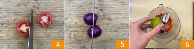 Faça o mesmo com os tomates 4 e depois descasque e corte a cebola 5. Em um recipiente alto e largo (ou em uma tigela), coloque os vegetais que você cortou grosseiramente e os tomates cereja inteiros. Adicione o suco do limão 6.