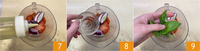 Despeje o azeite 7 e o vinagre 8, sal, pimenta e manjericão 9.
