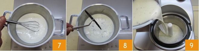 Aqueça em fogo baixo para dissolver o açúcar enquanto mistura com um batedor de mão 7: isso levará cerca de 2-3 minutos. A mistura deve quase ferver. Quando atingir a temperatura, desligue o fogo e retire a fava de baunilha 8. Deixe a mistura esfriar até atingir a temperatura ambiente. Neste ponto, despeje a mistura na sorveteira 9. Para esta sorveteira, não é necessário resfriar o recipiente na geladeira.
