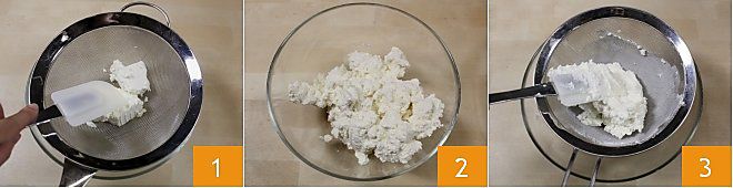 Para preparar o sorvete de ricota, comece pela própria ricota. Coloque a ricota na geladeira para escorrer em uma peneira de malha fina com uma tigelinha embaixo e cubra com filme plástico. Você pode fazer isso na noite anterior ou algumas horas antes da preparação para tirar o soro excessivo da ricota. Em seguida, peneire a ricota com uma peneira e a ajuda de uma espátula 1 ou com as costas de uma colher e recolha em uma tigelinha 2. Repita a operação pelo menos 3 vezes peneirando a ricota com a espátula e a peneira para torná-la mais cremosa 3. Uma vez peneirada, reserve.
