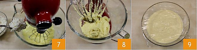 Agora, retome a ricota peneirada e adicione ao creme 7; bata por mais alguns minutos para obter um resultado cremoso 8. Agora que a massa está pronta, transfira para uma tigela e cubra com filme plástico 9. Coloque a tigela na geladeira por pelo menos 4 horas, para que o sorvete solidifique. Para uma mistura mais granulosa e encorpada, você pode bater as gemas e o açúcar com um batedor e adicionar a ricota e o aroma escolhido à mão, mexendo com uma espátula.
