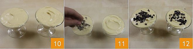 Passado o tempo necessário, retire a tigela da geladeira e sirva o sorvete nas taças 10 com uma colher de chá ou com um saco de confeitar com bico liso. Você pode decorar seu sorvete de ricota com gotas ou lascas de chocolate (11-12), ou pode decorá-lo de acordo com o gosto dos seus convidados: com granulado de avelãs, biscoitos inteiros ou picados, folhas de hortelã ou acompanhá-lo com frutas frescas! Como alternativa, para uma consistência de "semifreddo" você pode criar uma mistura mais granulosa e cremosa como indicado na segunda sequência: forre formas com papel manteiga molhado, preencha com o creme obtido e coloque na geladeira cobertos com filme plástico para que solidifiquem. Passado o tempo necessário, desenforme-os virando sobre pratinhos de sobremesa!