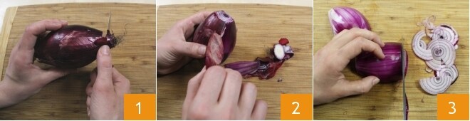 Para preparar a geleia de cebolas de Tropea, comece limpando as cebolas: descasque-as (1 e 2), lave-as, seque-as e corte-as em fatias finas 3. Se preferir, pode cortá-las usando um mandolim.