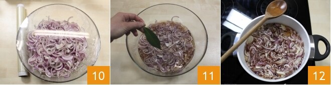 o conhaque 7 e a folha de louro 8. Misture bem para que as cebolas absorvam o sabor 9.