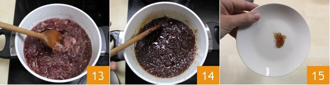 Volte para as cebolas: deixe-as ferver em fogo muito baixo 13 pelo tempo necessário para que tudo engrosse (isso levará cerca de 25-30 minutos). Após 30 minutos, sua geleia deve estar pronta 14: pegue um pouco da mistura com uma colher de chá e deixe cair uma gota em um prato. A gota deve permanecer compacta 15: este é o teste de que sua conserva está pronta. Se a gota escorregar e não ficar compacta, continue cozinhando pelo tempo necessário, mexendo frequentemente.