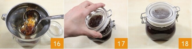 Depois, desligue o fogo e coloque a geleia ainda quente nos potes, usando um funil apropriado e uma concha 16, cuidando para deixar cerca de 1 centímetro de espaço da borda. Feche os potes 17 e deixe-os esfriar 18. Uma vez que os potes estiverem frios, coloque-os em um local fresco e escuro. Aguarde pelo menos um mês antes de consumir a geleia. Se utilizar potes com fecho de borracha, ao consumir a geleia de cebolas de Tropea, faça o teste do vácuo puxando a lingueta: se ao puxá-la produzir um som seco, significa que o conteúdo foi conservado com o vácuo correto. Caso contrário, se ao puxar a lingueta a vedação estiver "mole", significa que o vácuo não foi criado corretamente e é melhor não consumir o conteúdo. Se usar potes com tampas de rosca, uma vez que tenha colocado a geleia quente, feche bem as tampas sem apertar demais e deixe esfriar. Com o calor da mistura, o vácuo será criado, o que permitirá conservar o produto por muito tempo. Uma vez que os potes estiverem frios, verifique se o vácuo foi criado corretamente: você pode pressionar o centro da tampa e, se não ouvir o clássico "click-clack", o vácuo foi criado. Depois de verificar que a conservação foi bem-sucedida, sua geleia de cebolas de Tropea está pronta para ser saboreada!