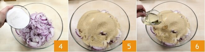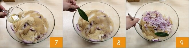 Coloque em uma tigela grande as cebolas fatiadas e adicione o açúcar granulado 4, o açúcar mascavo 5, o vinho 6