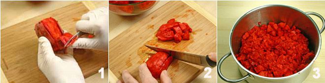 Para preparar a compota de figo-da-índia, comece pela sanitização dos potes, seguindo as diretrizes do Ministério da Saúde listadas no final da receita. Depois de realizar essa operação, passe para os figos-da-índia: primeiro, utilize um par de luvas de látex. A maneira mais fácil de remover a casca grossa é cortar as duas extremidades e fazer incisões com uma faca bem afiada ao longo de todo o figo-da-índia; então, usando a lâmina da faca, puxe a casca em sua direção 1. Corte a polpa dos figos-da-índia em cubos bem pequenos 2 e coloque-os em uma panela 3.
