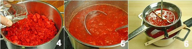 Coloque a panela no fogo, adicione o copo de água à polpa dos figos-da-índia 4. Deixe ferver até que os cubos de figo se desfaçam 5, depois retire a panela do fogo e passe a polpa por uma peneira para eliminar as sementes 6.