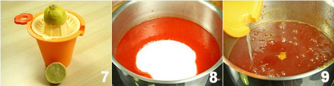 Coloque novamente a polpa peneirada na panela e reacenda o fogo; enquanto isso, esprema um limão 7. Adicione o açúcar à polpa 8 e quando a mistura voltar a ferver, adicione o suco de limão 9. Deixe ferver por mais 40 minutos; então, quando a mistura estiver bem espessa, desligue o fogo e transfira a compota de figo-da-índia quente para os potes previamente sanitizados, deixando 1 centímetro de espaço da borda. Aperte bem as tampas (mas sem apertar excessivamente) e deixe esfriar. Com o calor da compota, será criado o vácuo, o que permitirá conservar o produto por muito tempo. Depois que os potes esfriarem, verifique se o vácuo foi criado corretamente: você pode pressionar o centro da tampa e, se não ouvir o clássico "click-clack", o vácuo foi criado. Sua compota de figo-da-índia está pronta para ser saboreada!