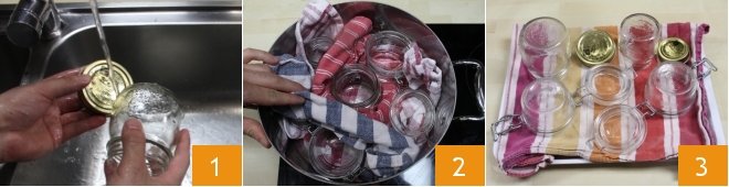 Para preparar a geleia de figos e baunilha, comece com a sanitização dos potes e das tampas que servirão para conservar a geleia, seguindo as diretrizes indicadas pelo Ministério da Saúde no final da receita. Lave os potes em água corrente 1 e coloque-os dentro de uma panela grande. Coloque panos de prato entre os vários potes para evitar possíveis choques durante a fervura. Encha com água até cobrir completamente os potes 2 e deixe ferver em fogo baixo por 20 minutos, depois coloque também as tampas e deixe ferver por mais 10 minutos. Desligue o fogo e deixe esfriar assim. Uma vez frios, retire os potes e deixe-os secar completamente sobre um pano de cozinha limpo 3.