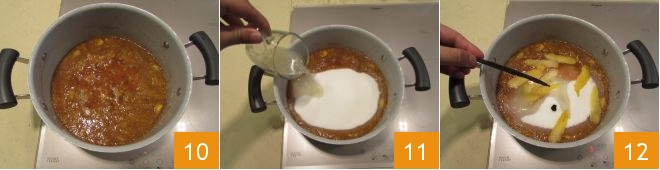 Assim que a mistura de figos atingir a fervura 10 adicione o açúcar, o suco de limão 11, a casca, a fava de baunilha e suas sementes 12.