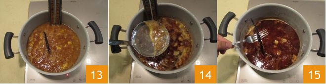 Misture tudo e continue cozinhando 13 até que a geleia atinja a temperatura de 104° (use um termômetro de cozinha para medir a temperatura correta). Durante este tempo, use uma escumadeira para eliminar a espuma que se formará na superfície 14, para obter uma compota brilhante, uma vez resfriada. Assim que atingir a temperatura correta, retire a geleia do fogo e elimine a fava de baunilha 15.