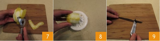 Enquanto isso, com a ajuda de um descascador de batatas, descasque o limão 7, reservando a casca, e extraia o suco, filtrando-o 8. Neste ponto, faça uma incisão na fava de baunilha e raspe as sementes usando uma faca afiada 9.