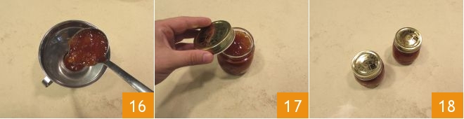 Deixe amornar até que se forme uma leve película na superfície, depois misture-a e encha os potes sanitizados, usando uma concha ou o funil apropriado para geleias 16. Encha os potes, cuidando para deixar 1 centímetro da borda e feche bem as tampas sem apertar muito 17. Deixe esfriar 18. Com o calor da geleia, formará-se o vácuo, que permitirá conservar o produto por muito tempo. Quando os potes tiverem esfriado, verifique se o vácuo foi formado corretamente: você pode pressionar no centro da tampa e, se não ouvir o clássico "click-clack", o vácuo foi formado. Sua geleia de figos e baunilha está pronta para ser apreciada!