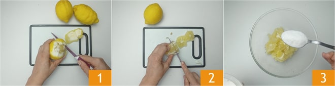 Para preparar a geleia de limão sem casca, a primeira coisa é escolher limões de excelente qualidade com casca grossa. Lave-os, seque-os e descasque-os ao vivo 1. Corte-os em fatias 2 e, à medida que for cortando, coloque-os em uma tigela. Serão necessários 500 g. Em seguida, adicione o açúcar 3, misture e coloque na geladeira por 4 horas, cobrindo com filme plástico.