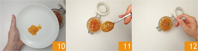 Antes de desligar o fogo, você pode fazer o teste do pratinho: basta colocar uma colherzinha em um pratinho e incliná-lo; se a geleia não escorregar rapidamente, significa que está pronta. Coloque a geleia nos potes esterilizados 11 12.