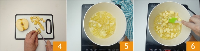Passadas as 4 horas, descasque a maçã e corte-a em cubos 4, você precisará de 100 g. Despeje os limões, junto com o líquido de maceração em uma panela 5, adicione também a maçã 6 e cozinhe em fogo baixo, mexendo de vez em quando por cerca de 20 minutos.