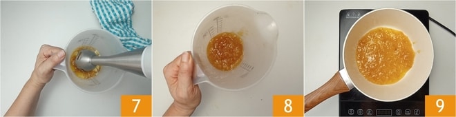 Na metade do cozimento, bata a geleia com um mixer de imersão 7, dessa forma ela ficará lisa 8. Transfira novamente para a panela e cozinhe por mais 20 minutos até atingir a consistência desejada 6, considerando que uma vez fria, ela ficará mais sólida.