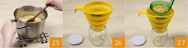 Retire a panela do fogo e mexa, dissolvendo eventuais espumas 25. Prepare os potes, que você terá sanitizado, e providencie um funil para facilitar o envase da geleia 26. Despeje a geleia ainda fervendo nos potes, com a ajuda de uma concha 27 e