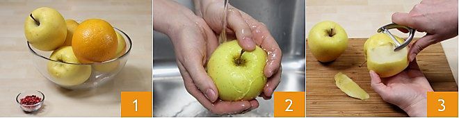 Para preparar a geleia de maçãs e laranjas com pimenta rosa 1, primeiro lave as maçãs em água corrente 2. Com um descascador de legumes, descasque as maçãs 3,