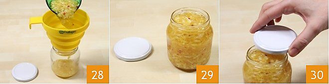 continue 28 a despejar até encher os potes até a borda 29, então, com as tampas apropriadas, feche-os 30