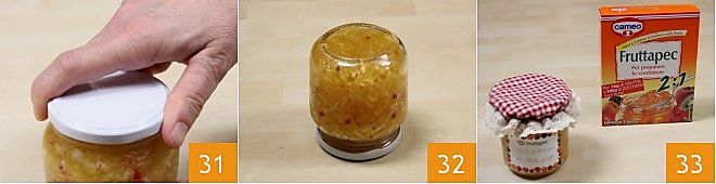 apertando bem e certificando-se de que estejam hermeticamente fechados 31. Vire os potes ainda quentes por 5 minutos, assim criará o vácuo e esterilizará também as tampas 32. Sua geleia de maçãs e laranjas com pimenta rosa está pronta: uma vez que atingir a temperatura ambiente, lembre-se de etiquetar o pote para deixá-lo reconhecível 33.
