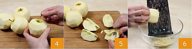 retire o talo 4, corte-as em quartos e retire, com uma faquinha, também o miolo interno 5. Com um ralador de furos largos, rale as maçãs 6,