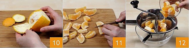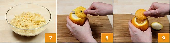 colocando-as em uma tigela grande 7. Descasque agora as laranjas, cortando com uma faquinha as duas extremidades (8-9);