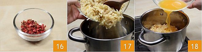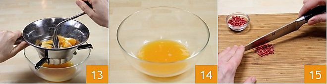 e passe-os girando delicadamente 13, de modo a espremer todos os gomos 14. Pique finamente 1 colher de sopa de pimenta rosa com a ajuda de uma faca bem afiada 15; alternativamente, você pode usar um mixer.