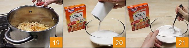 por fim, adicione a pimenta rosa, tanto a picada quanto os grãos inteiros 19. Estas operações devem ser feitas com o fogo apagado. Em uma tigela, coloque 500 g de açúcar refinado e adicione 1 sachê de Fruttapec 2:1 20, misture então os dois ingredientes com uma colher 21.