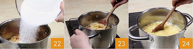 Adicione o açúcar com o Fruttapec frio à fruta, diretamente na panela 22. Leve a mistura à fervura, mantendo o fogo alto e continuando a mexer para não grudar no fundo 23. Quando a mistura atingir a fervura, deixe ferver por 3 minutos em fogo alto, sempre mexendo 24.