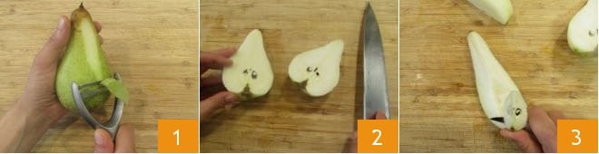Para preparar a compota de peras e gengibre, comece sanitizando os potes conforme indicado na caixa no final da receita. Neste ponto, pegue as peras Abate e remova a casca externa 1, depois divida-as ao meio 2, em seguida em quartos para remover mais facilmente as sementes 3.