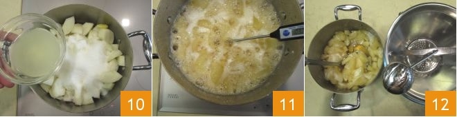 o suco de limão 10 e cozinhe em fogo médio. De vez em quando, mexa a panela para garantir que o fundo não grude. Uma vez que o açúcar estiver dissolvido, aumente o fogo e, monitorando a temperatura com um termômetro, certifique-se de que ela atinja 108°C 11 antes de tirar a compota do fogo; ao atingir 108°C, a compota estará pronta. Transfira a mistura para um passa-verduras 12