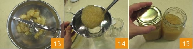 e passe tudo 13. Utilize os potes higienizados e preencha-os com a compota de peras e gengibre ainda quente 14, depois feche bem 15. Deixe esfriar completamente os potes virados de cabeça para baixo sobre um pano limpo, até esfriar completamente. Verifique o vácuo, pressionando o centro da tampa de rosca para certificar-se de que não há o "click-clack" que indicaria que o vácuo não foi formado.