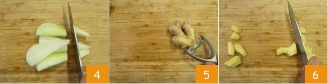 Reduza as peras em pedaços 4; depois descasque a raiz de gengibre fresca 5 e reduza também em pedaços 6. Finalmente, esprema o suco de limão.