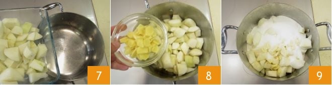 Em uma panela grande coloque as peras 7, o gengibre 8, o açúcar 9,