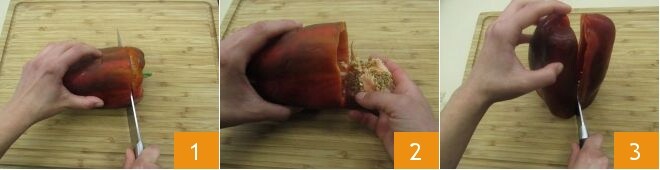 Para preparar a geleia de pimentão, a primeira coisa que você deve fazer é lavar os pimentões, depois cortar a parte superior com o cabinho 1 e remover as sementes internas 2. Divida os pimentões ao meio no sentido do comprimento 3,