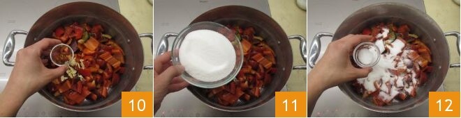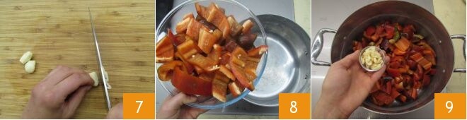 Descasque os dentes de alho e corte-os em rodelas bem finas 7. Em uma panela grande, coloque os pimentões 8, o alho 9,