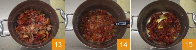 Misture tudo 13 e cozinhe em fogo médio, mexendo de vez em quando, se necessário. Use um termômetro de cozinha e deixe cozinhar até atingir a temperatura de 108°C. Neste ponto, desligue o fogo 15