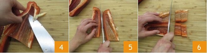 remova os filamentos internos 4 e divida novamente ao meio 5, finalmente corte-os em pedaços de tamanho médio 6. Proceda da mesma forma com os outros pimentões e reserve.