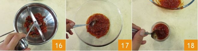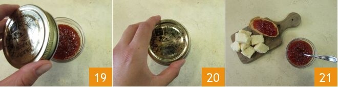 e transfira a geleia para um passatudo colocado sobre uma tigela. Gire a manivela 16 até reduzir os pimentões a um purê 17. Se a geleia ainda estiver bem quente, você pode prosseguir, caso contrário, será necessário aquecê-la novamente no micro-ondas ou na panela. Envasem a geleia quente em um ou mais frascos de vidro esterilizados 18.